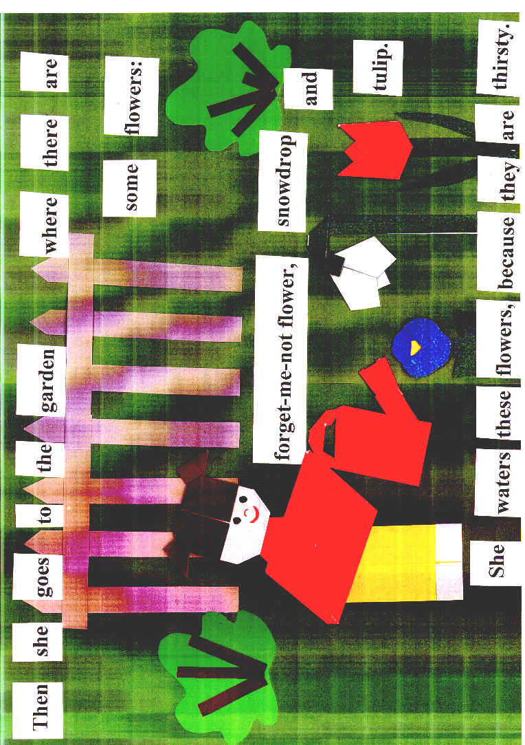 Then se goes to the garden where there are some flowers: forget-me-not flowers, snowdrops and tulips. She waters these flowers, because they are thirsty.