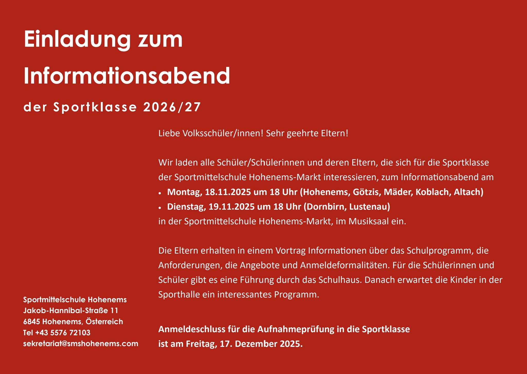 Infoabende für die Sportklasse 2026/27