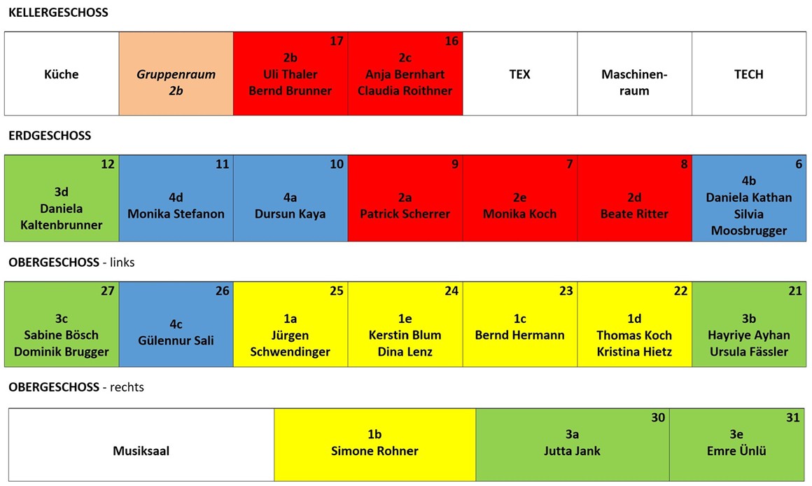 Hier sind alle 19 Klassen aufgelistet mit den jeweiligen Klassenvorstände. Die a-Klasse in jeder Stufe ist die Klasse, die den sportlichen Schwerpunkt (mit zusätzlichen Sportstunden) in Anspruch nimmt.
